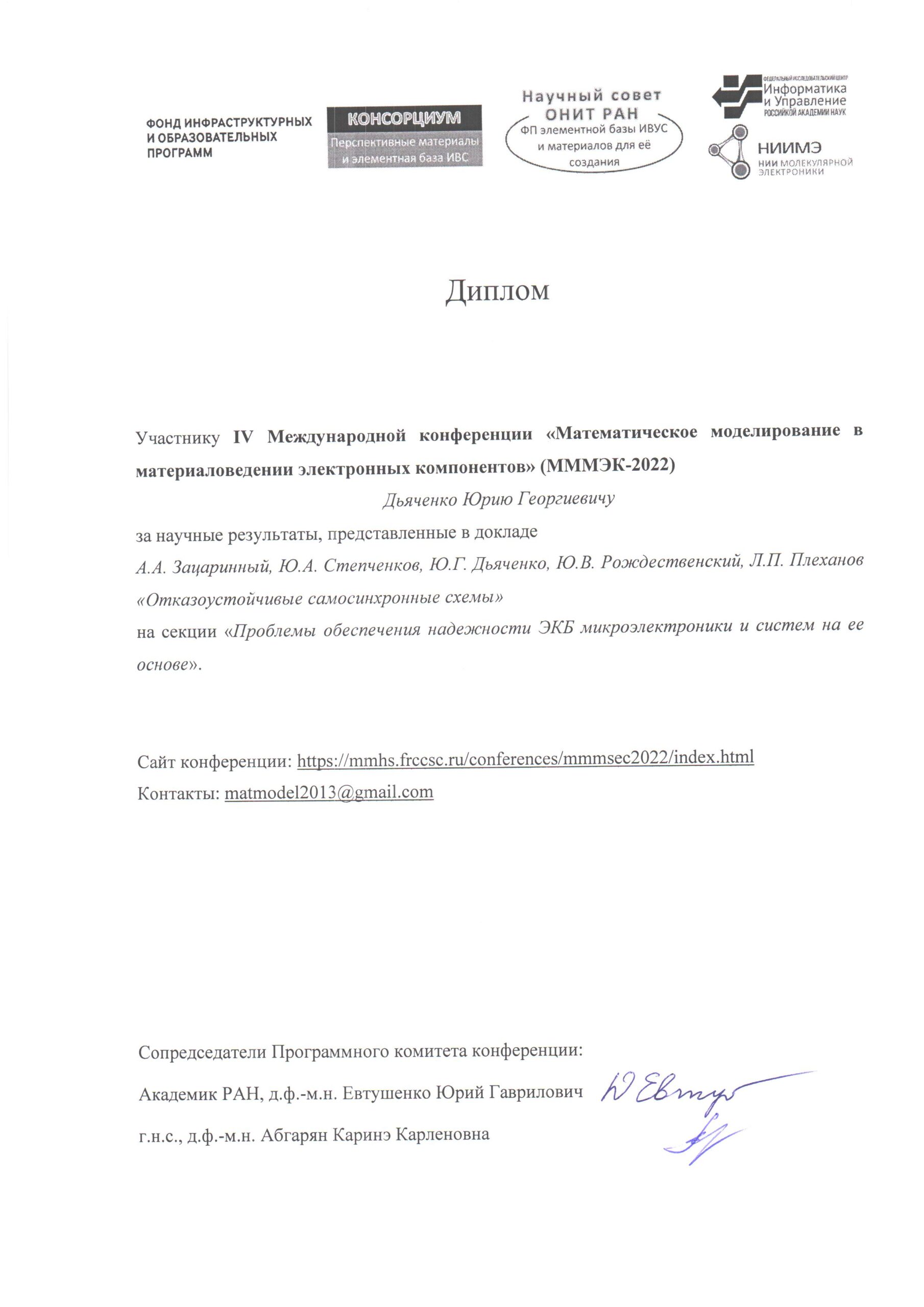 А.А. Зацаринный, Ю.А. Степченков, Ю.Г. Дьяченко, Ю.В. Рождественский, Л.П Плеханов. Отказоустойчивые самосинхронные схемы // Математическое моделирование в материаловедении электронных компонентов. ММMЭК–2022. 24–26 октября 2022 г., Москва, Россия. Материалы IV Международной конференции. (сборник тезисов). – Москва: МАКС Пресс, 2022. C 176-178.